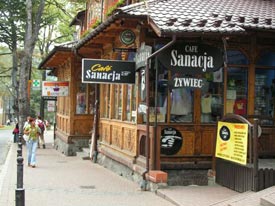 | | | | |  | | W urokliwym, drewnianym domu przy Krupówkach, otwiera swe podwoje dla gości Cafe Sanacja. Po wejściu trafiamy do klimatycznego miejsca. Półmrok, stłumione światło, rozwieszone na ścianach obrazki tworzą miły, nostalgiczny, sprzyjający posiedzeniu nastrój. Miła i profesjonalna obsługa, sącząca się z głośników klasyka rocka i jazz oraz wybór około 100 rodzajów drinków, pozwolą spędzić tutaj niejeden mily wieczór.